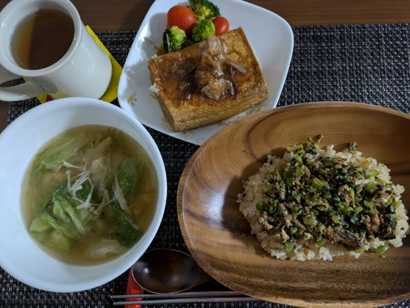 厚揚げステーキをメインに、レタスの味噌汁、小松菜と鯖缶の炒めをのせた玄米ごはんを食べた、ある日の一人の夜ごはんです。